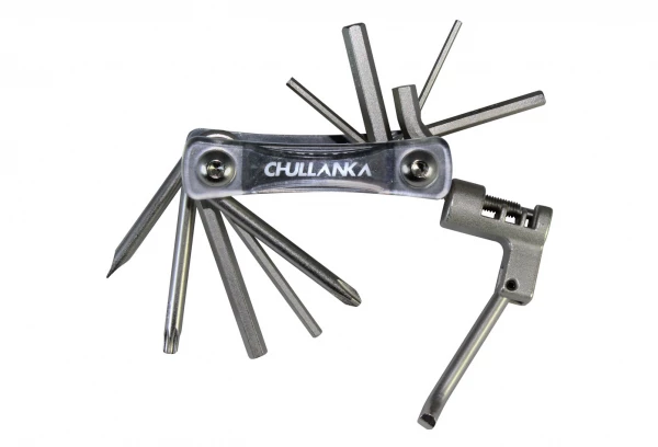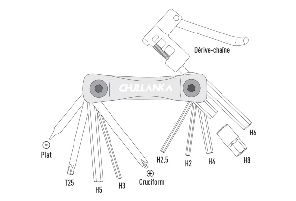 Le Compact Tool 11 de Chullanka est un multi-outils très complet de 11 fonctions : Hex : 2 , 2,5 , 3 , 4 , 5 , 6 et 8 mm, torx 25, tournevis plat et tournevis cruciforme, ainsi qu’un dérive-chaîne. Ses bras en acier et ses outils en chrome-vanadium vous garantissent une solidité sur le long terme.